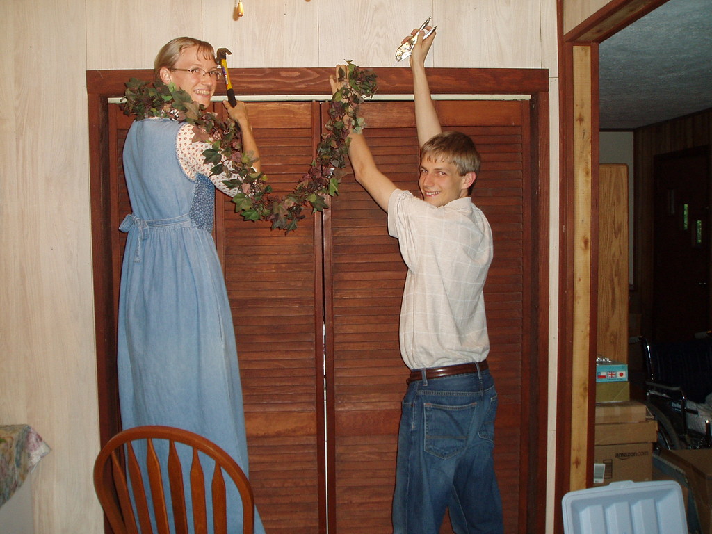 Stringing grape ivy above our laundry-room closet.