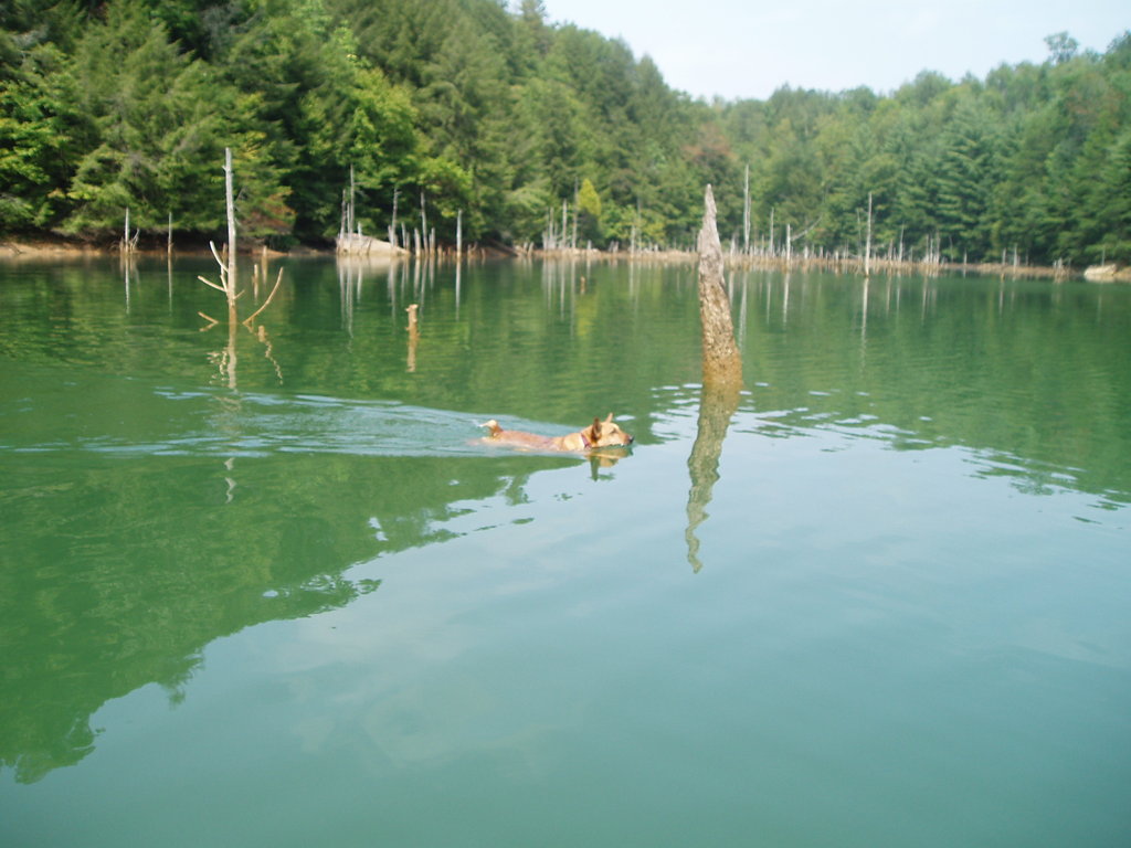 Nellie couldn't take it any longer, she jumped into the water and started swimming to Amber! She was rescued and put back into the canoe, much to her relief!