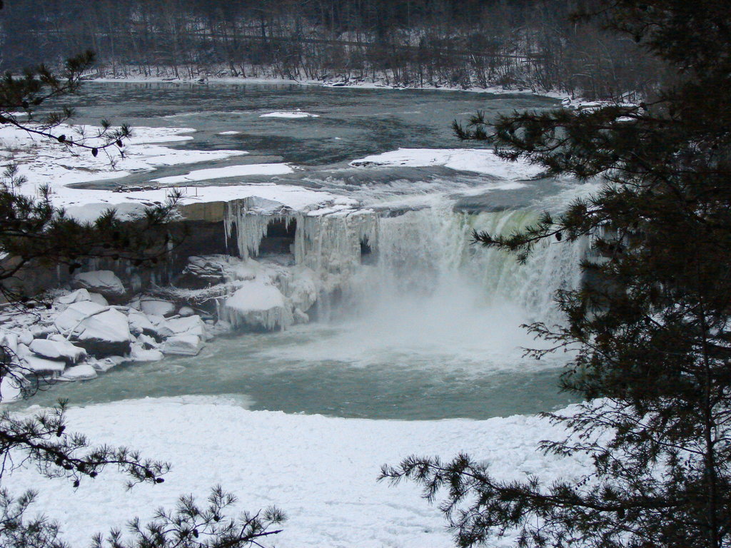Photo Caption: The view of Cumberland Falls from the vantage point was beautiful! Not only can you see hundreds of gigantic icicles hanging off the falls, but also a large quantity of broken ice chunks floating below the falls (making it look like snow). Show AllShow All