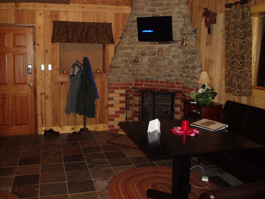 Looking at the dining room table and propane fireplace from the kitchen.