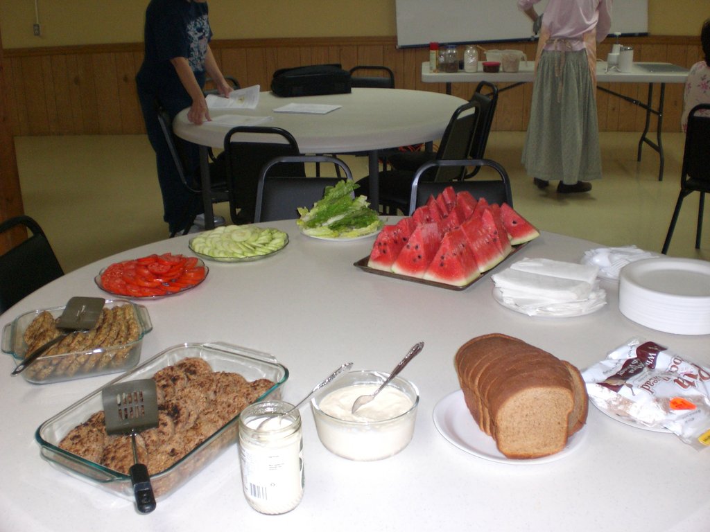 Photo Caption: Picnic spread! Burger sandwiches and watermelon. Yummy! Show AllShow All