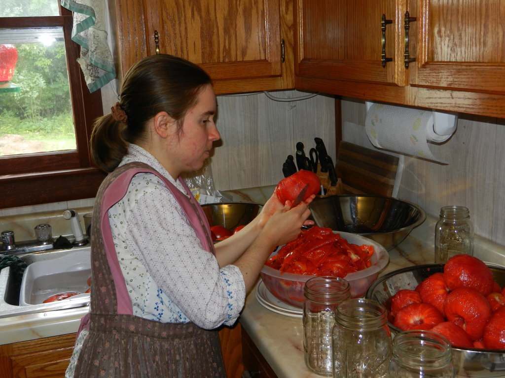 Photo Caption: It's time for tomatoes! Once again, Kim had the a-peeling job. :) Show AllShow All
