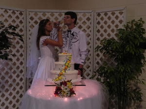 Laura getting her last minute refreshments in. She made her own dress--it was beautiful!