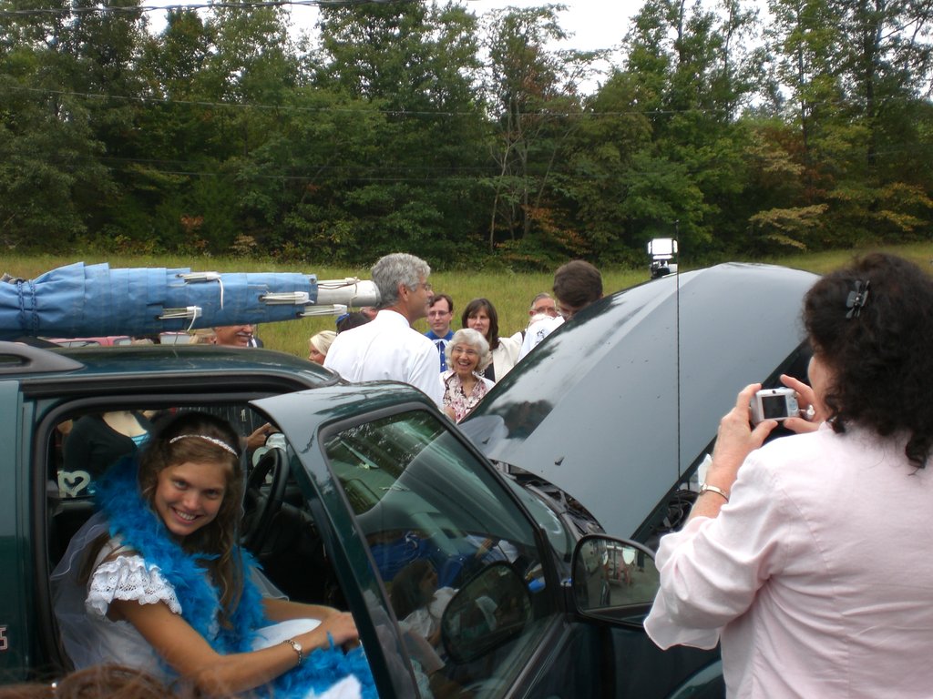 Photo Caption: Well..... they were going to drive away, but the car started honking when they started it up! Groom is hunting for the source of noise under the car hood. Show AllShow All