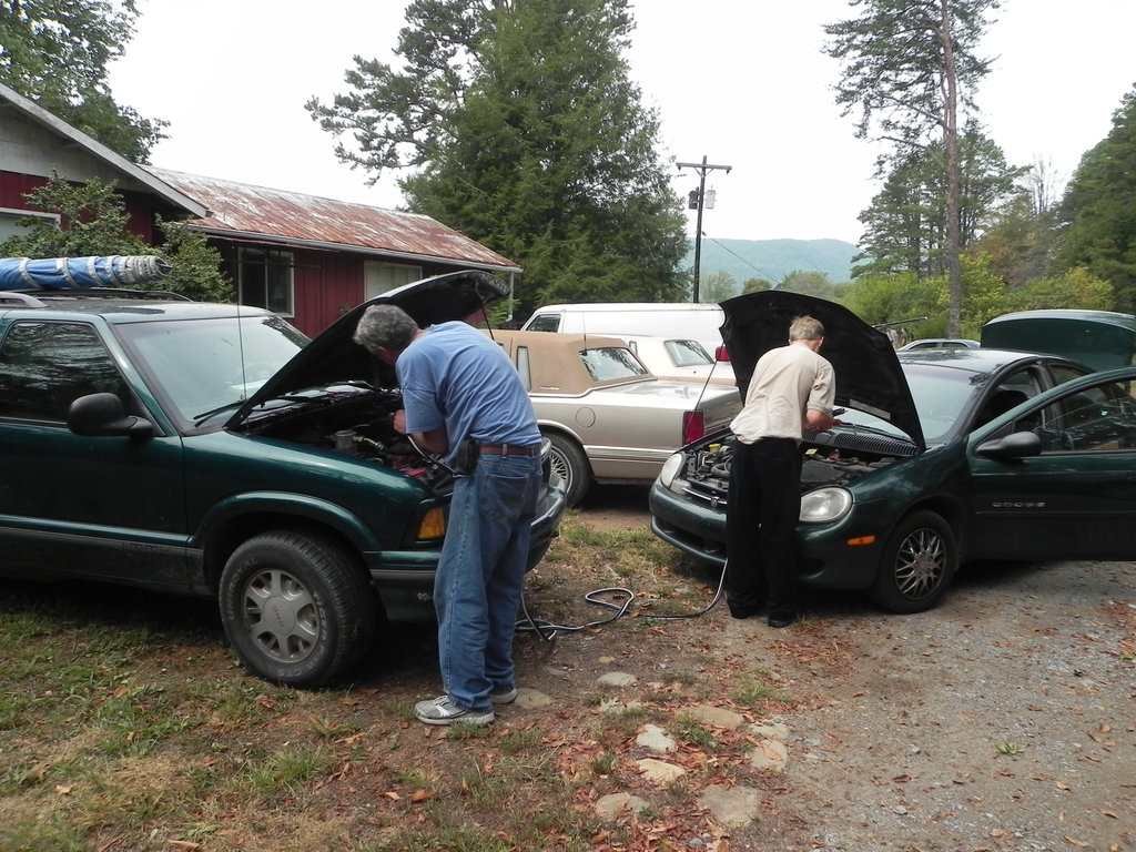 Jump-starting the groom's car.