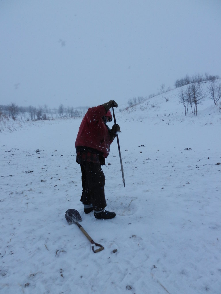 Gordon chipping the ice from the water hole for them to drink.
