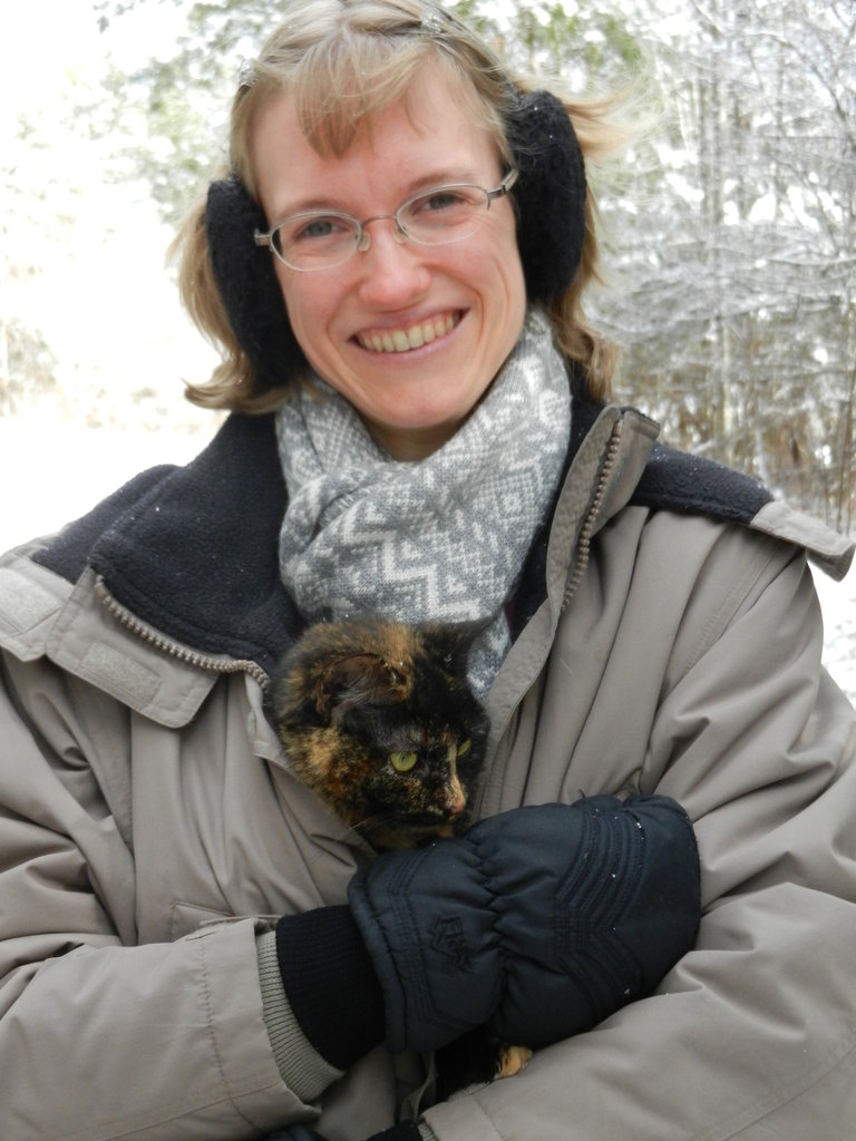 Marble staying warm and looking at all the snow from the safety of Kristina's coat.