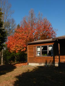The ornamental pear tree is always the last to loose its leaves. It is so pretty for Thanksgiving! Marble walked through the picture...