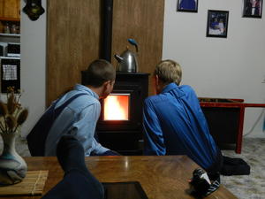 Daniel and Isaac checking out Dads pellet stove