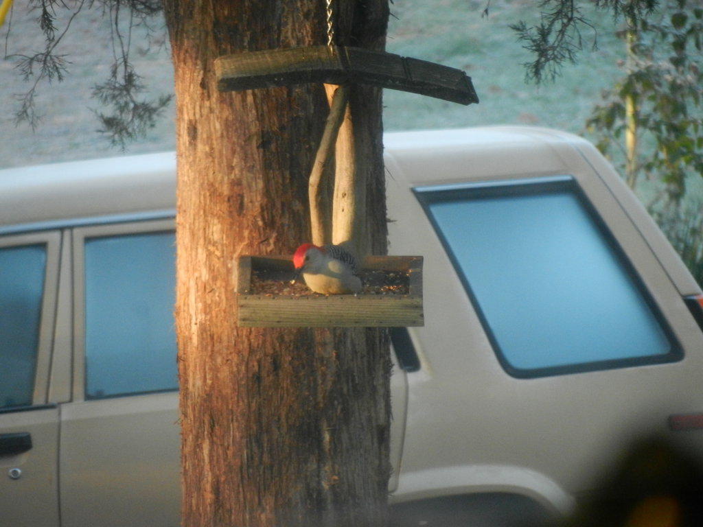 Photo Caption: Bird feed war sequence on a frosty morning. Woodpecker claims the feeder. Show AllShow All