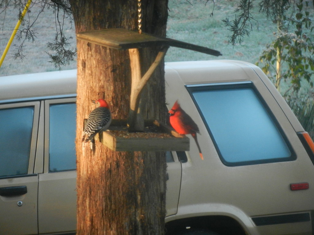 Woodpecker and cardinal meet...