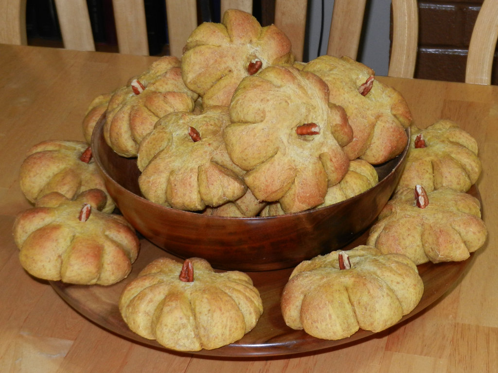 Photo Caption: Thanksgiving dinner was quite the feast! Besides the usual mashed potatoes and gravy, and Timothy's gluten steaks, we had these cute pumpkin dinner rolls that Timothy made! Show AllShow All