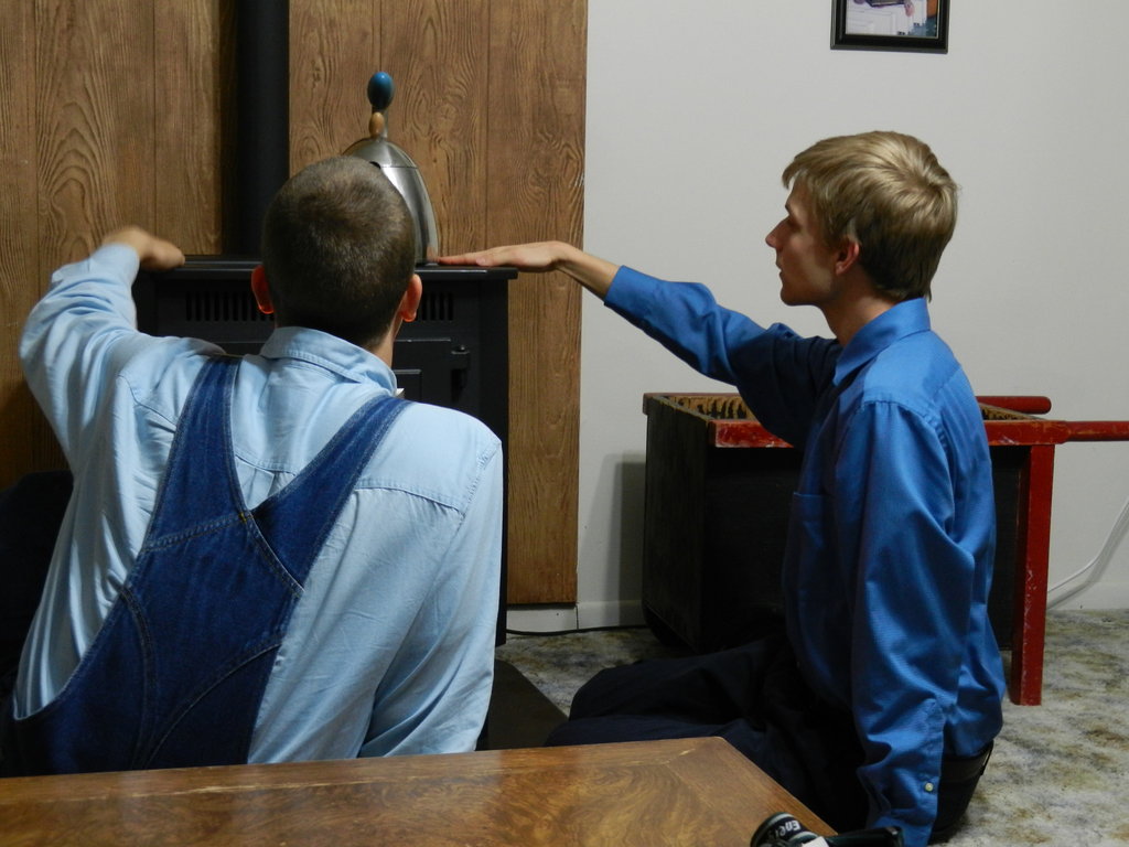 Photo Caption: Daniel and Isaac checking out Dads pellet stove Show AllShow All